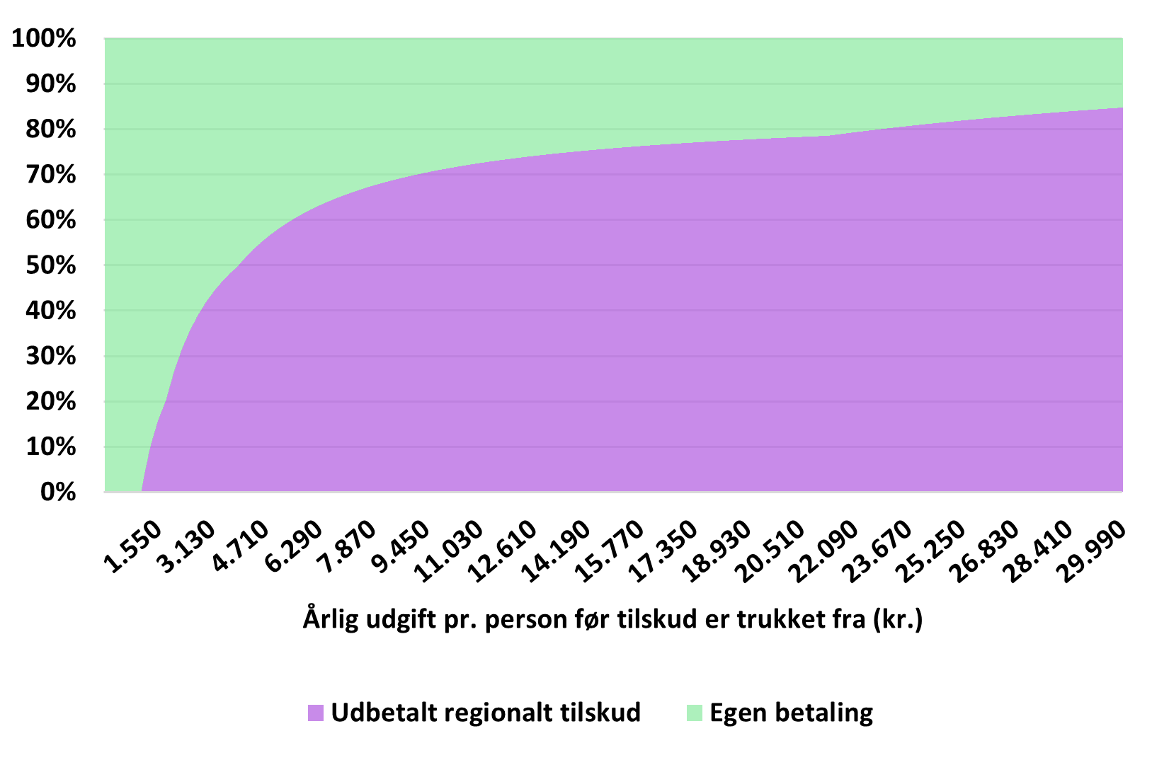 Fig 2. Fordeling af egen betaling og tilskud som en funktion af årlig udgift pr. person før tilskud er trukket fra